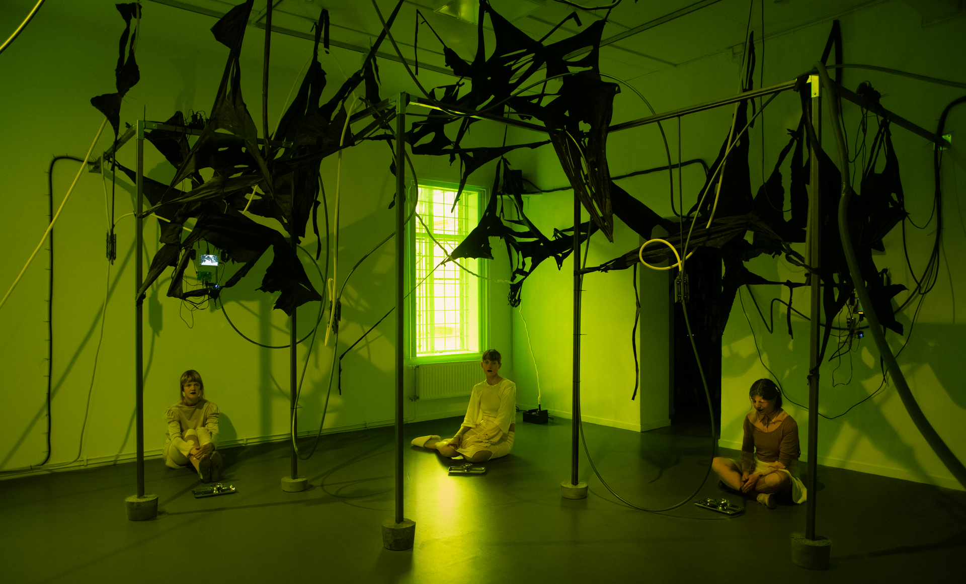 The visitor enters a world overgrown by organic and machine-like forms, where boundaries between body and system are dissolved. A choir of voices luring the visitor into a shimmering trap where control is as seductive as it is unsettling.